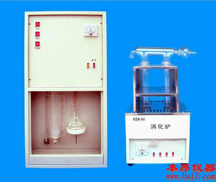 KDN-08A型定氮儀蒸餾器內(nèi)加水選用自來(lái)水,備有自動(dòng)加熱與補(bǔ)液裝置。自動(dòng)控制自來(lái)水加熱產(chǎn)生蒸汽,對(duì)已消煮的樣品進(jìn)行蒸餾。將消化過(guò)程中產(chǎn)生的硫酸銨轉(zhuǎn)化成氨并與硼酸反應(yīng)生成硼酸銨。